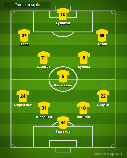 «Олександрія»: Єрмаков – Мартинюк, Шабанов, Логінов (Ващенко, 69), Скорко – Шостак (Мишньов, 59), Калюжний, Булеца (Ковалець, 69) – Цара, Кулаков (Філіппов, 60), Козак (Галоян, 77).