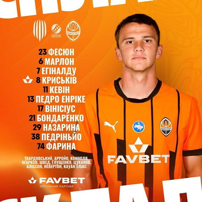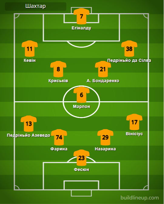«Шахтар»: Фесюн – Педріньйо Азеведо (Огарков, 74), Фарина, Назарина, Вінісіус – Криськів, Марлон (Цуканов, 60), А. Бондаренко – Кевін (Невертон, 74), Егіналду (Еліас, 77), Педріньйо да Сілва (Аліссон, 60).