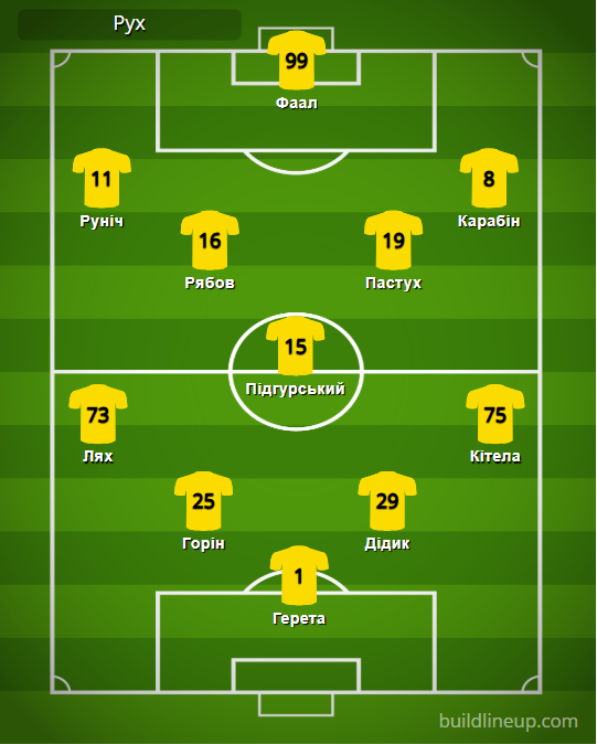 «Рух»: Герета – Лях, Горін (Холод, 72), Дідик, Кітела (Роман, 67) – Рябов (Притула, 72), Підгурський, Пастух – Руніч, Фаал, Карабін.