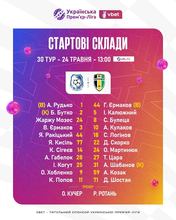 Чорноморець та Олександрія назвали стартові склади на матч 30-го туру