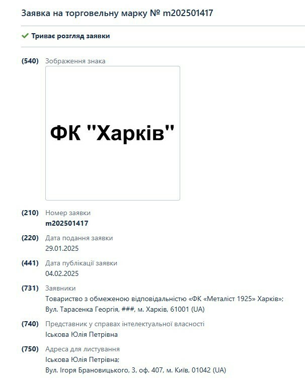 Це випливає із запиту, поданого на реєстрацію відповідної торговельної марки ФК «Харків» (номер заявки: m202501417).