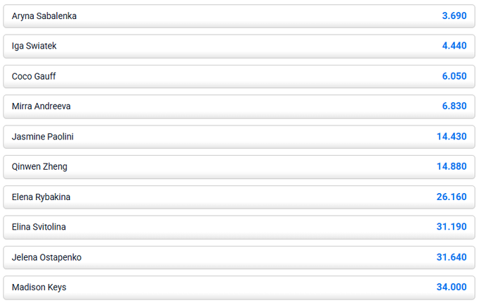 Букмекери ведуть фавориткою першу ракетку світу Аріну Соболенко за коефіцієнт 3.69.