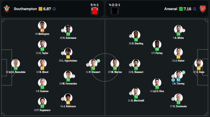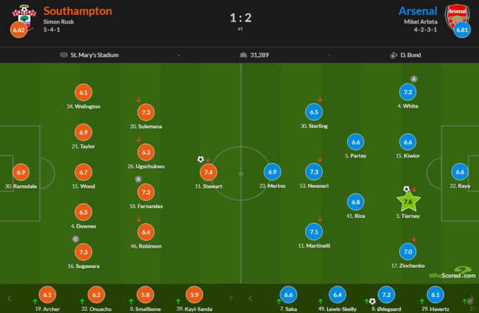 Найкращим гравцем за версією обох порталів став захисник «канонірів» Кіран Тірні. На його рахунку 1 гол і оцінки 8.1 і 7.6 відповідно.