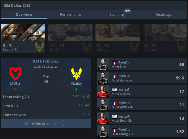 На третій мапі Inferno сценарій повторився: MOUZ взяли лідерство на старті, однак Vitality перехопили ініціативу в збройних раундах. Перемігши першу половину 7:5, Vitality впевнено розпочали захист і втримали перевагу, навіть вигравши вирішальний раунд на слабкому закупі, щоб закрити серію та підняти ще один трофей над головами.
