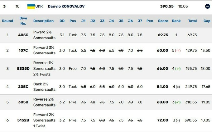 П'яту нагороду команді приніс Данило Коновалов, який став бронзовим призером у чоловічих стрибках з 1-метрового трампліна. 22-річний українець зумів вибороти першу особисту медаль у кар'єрі на континентальних чемпіонатах.