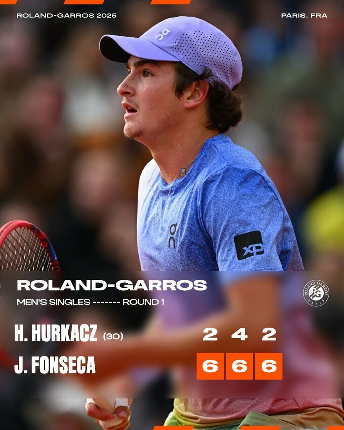 18-річний бразильський тенісист Жоау Фонсека (ATP 65) виграв стартовий матч на Відкритому чемпіонаті Франції 2025.
