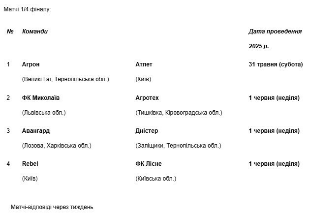Асоціація аматорського футболу України оприлюднила склад пар чвертьфінальної стадії чемпіонату України серед аматорських команд сезону 2024/25.