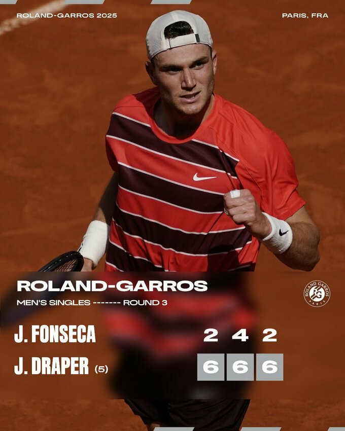 П’ята ракетка світу в чоловічому одиночному розряді Джек Дрейпер вийшов до 1/8 фіналу Відкритого чемпіонату Франції 2025 року.