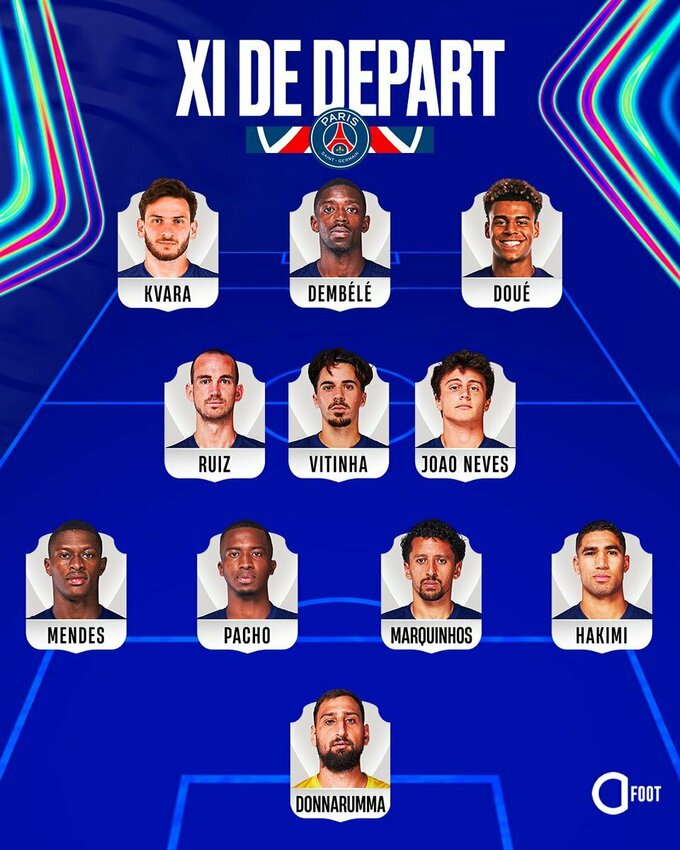 Стартовий склад «ПСЖ»: Доннарумма, Маркіньос, Пачо, Хакімі, Мендеш, Руїс, Вітінья, Невеш, Кварацхелія, Дуе, Дембеле.