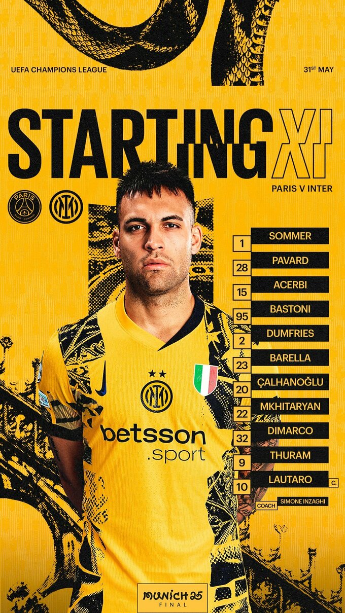 Стартовий склад «Інтера»: Зоммер, Бастоні, Ачербі, Павар, Думфріс, Чалханоглу, Мхітарян, Барелла, Дімарко, Тюрам, Лаутаро.
