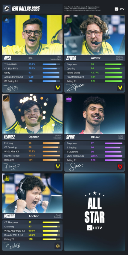 Spinx став найкращим Closer – особливо ефективним на Т-сайді (0.22 trade kills на Т-раунд, 1.42 clutch points на 24 раунди). А flameZ виграв боротьбу за Opener, випередивши Senzu та XANTARES завдяки впливу на перемогу Vitality – рейтинг 1.19 та +1.61% Round Swing.