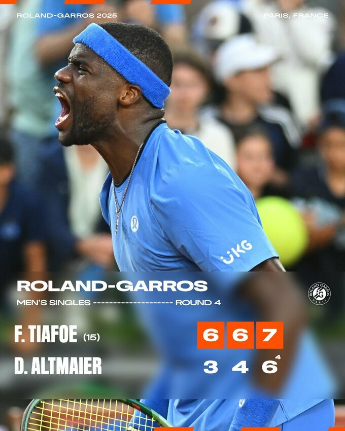 Американський тенісист Френсіс Тіафо (ATP 16) вийшов до чвертьфіналу Відкритого чемпіонату Франції 2025, який проходить на ґрунтових кортах у Парижі.