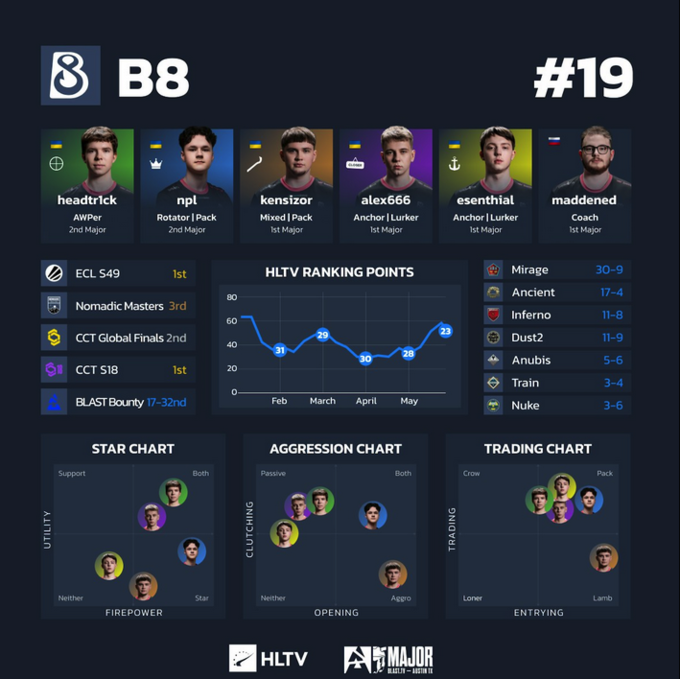 Найсильнішими мапами B8 залишаються Mirage (30 перемог і 9 поразок), Ancient (17–4) та Inferno (11–8). Водночас на Dust2, Anubis, Train і Nuke результати значно гірші, і саме ці мапи можуть стати слабким місцем команди.
