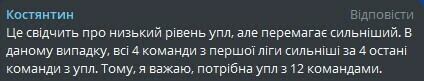 Костянтин: Це свідчить про низький рівень УПЛ, але перемагає сильніший. В даному випадку, всі 4 команди з Першої ліги сильніші за 4 останні команди з УПЛ. Тому, я вважаю, потрібна УПЛ з 12 командами.