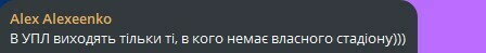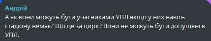 Андрій: А як вони можуть бути учасниками УПЛ якщо у них навіть стадіону немає? Що це за цирк? Вони не можуть бути допущені в УПЛ.