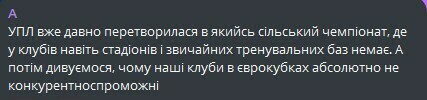 A: УПЛ вже давно перетворилася в якийсь сільський чемпіонат, де у клубів навіть стадіонів і звичайних тренувальних баз немає. А потім дивуємося, чому наші клуби в єврокубках абсолютно не конкурентноспроможні.
