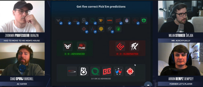 До списку команд, які пройдуть стадію без поразок (3:0), вони включили данську HEROIC та китайську TYLOO. Останній вибір особливо здивував, оскільки азійські команди не вважаються сильними конкурентами на міжнародній арені.