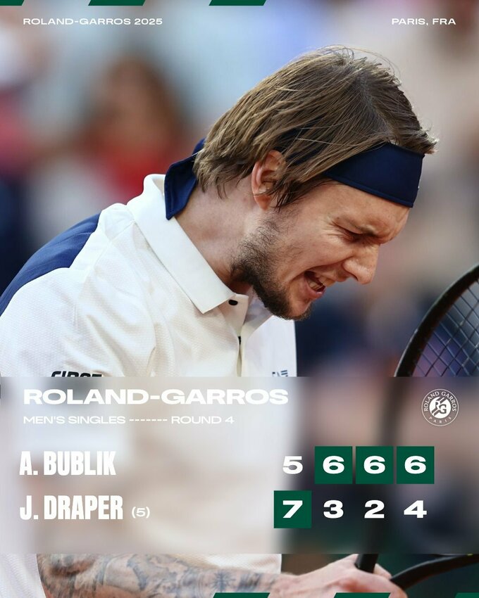П’ята ракетка світу Джек Дрейпер завершив виступ на Відкритому чемпіонаті Франції 2025, який проходить на ґрунтових кортах у Парижі.