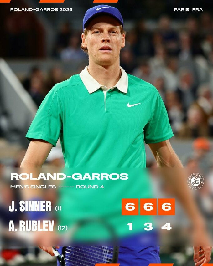 У 1/8 фіналу паризького мейджора італійський тенісист у трьох сетах упорався з «нейтральним» Андрєєм Рубльовим (ATP 15). Для Сіннера це вже 18-та перемога поспіль на турнірах Великого шолома.
