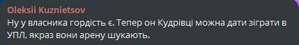 Oleksii Kuznietsov: Ну у власника гордість є. Тепер он Кудрівці можна дати зіграти в УПЛ, якраз вони арену шукають.