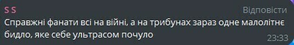 S S: Справжні фанати всі на війні, а на трибунах зараз одне малолітнє бидло, яке себе ультрасом почуло.
