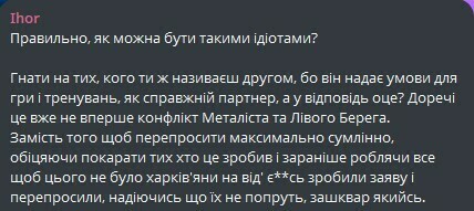 Ihor: Правильно, як можна бути такими ідіотами? Гнати на тих, кого ти ж називаєш другом, бо він надає умови для гри і тренувань, як справжній партнер, а у відповідь оце? До речі це вже не вперше конфлікт Металіста та Лівого Берега. Замість того щоб перепросити максимально сумлінно, обіцяючи покарати тих хто це зробив, і зараніше роблячи все, щоб цього не було, харків'яни на від' є**сь зробили заяву і перепросили, надіючись що їх не попруть, зашквар якийсь.