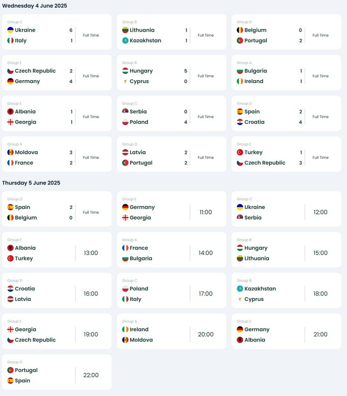 22 команди поділені на 5 груп по 4 або 5 збірних. На груповому етапі ЧЄ-2025 збірна України у 3-му турі зіграє з Польщею (6 червня о 16:00).