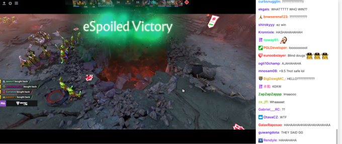 Вперше на змагальній сцені сталося так, що одна з команд погоджується з поразкою і пише «gg», але кріпи самі спушили трон супернику. Таким чином, гра визначила переможцем тих, хто вже здався.