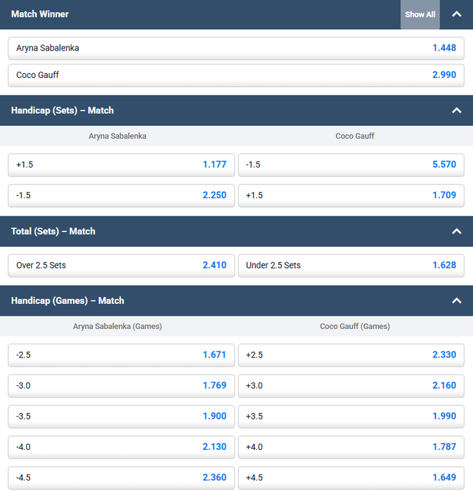 Перед стартом протистояння букмекерські контори виставили актуальні котирування. Фавориткою є Соболенко, на перемогу якої можна поставити з коефіцієнтом 1.44. Шанси Гофф розцінюються в 2.99.