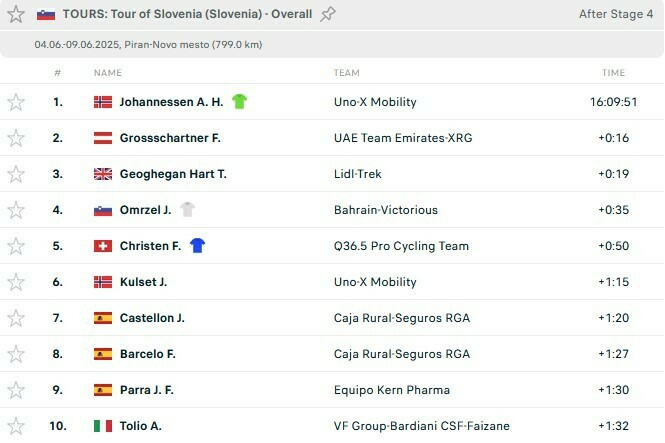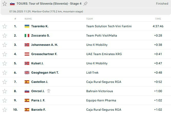 У суботу, 7 червня, відбувся 4-й етап велогонки Тур Словенії-2025. Перемогу здобув представник команди Solution Tech Vini Fantini Кирило Царенко.
