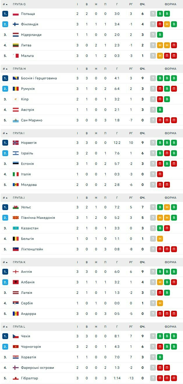 Кваліфікація ЧС-2026. Як виглядають турнірні таблиці після 3 турів