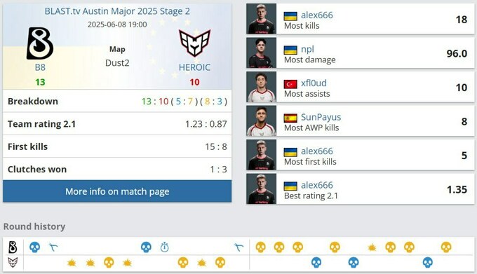 Після гучної перемоги над Falcons у першому турі, B8 додали до свого активу ще одну вражаючу перемогу — цього разу над HEROIC. Успіх прийшов завдяки добре зкоординованій грі на стороні атаки на мапі Dust2.