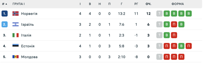 Збірна Італії після катастрофічного стару у кваліфікації (поразка Норвегії 0:4) здобула першу перемогу у групі. Скуадра Адзурра на домашньому полі завдяки голам Джакомо Распадорі та Андреа Камб'язо здолала Молдову – 2:0.