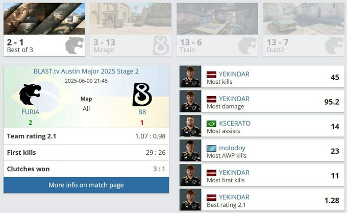 Проте на Train усе перевернулося: після стартового лідерства 4:0 B8 втратили ініціативу, а Марекс «YEKINDAR» Галінскіс із трьома відкриттями та 89 ADR допоміг FURIA переламати хід гри.