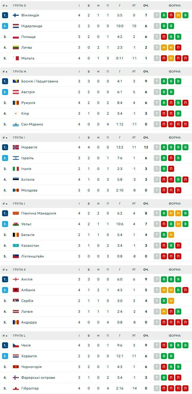 Вісім м'ячів від Нідерландів. Як виглядають турнірні таблиці відбору до ЧС