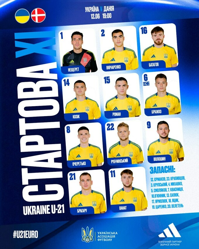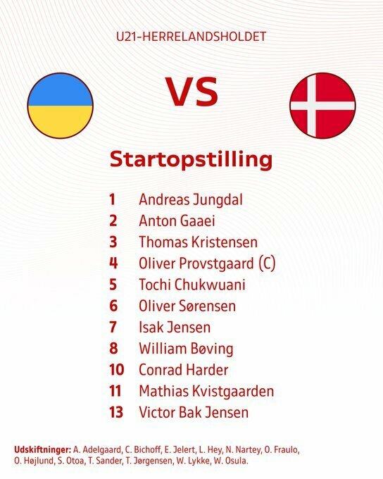Данія U-21: Юнгдаль – Бак Єнсен, Нільсен, Крістенсен, Гаї – Серенесен, Чуквуані (Нарті, 57), Бевінг (Фрауло, 81) – Єнсен (Йоргенсен, 81), Гардер (Осула, 70), Квістгорден (Бішофф, 57).