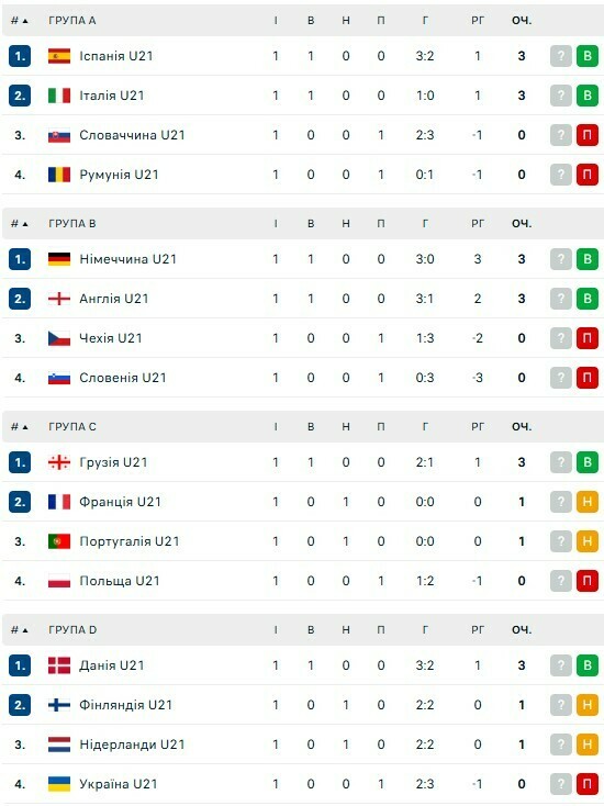 Підсумки 1-го туру Євро-2025 U21. Турнірна таблиця: Україна замикає квартет
