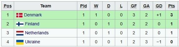 Данія очолила групу з 3 очками, далі йдуть Фінляндія та Нідерланди (по 1 балу), Україна замикає квартет (0 очок).