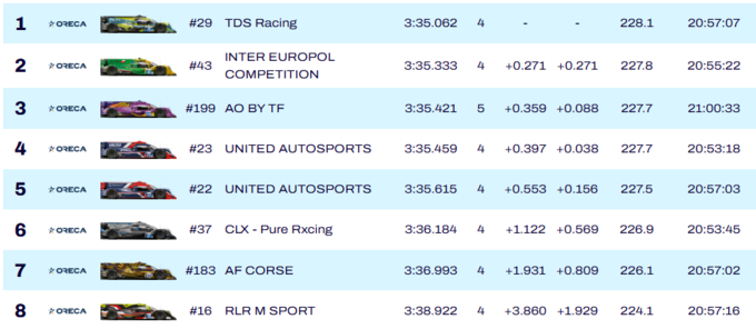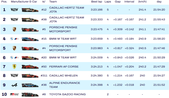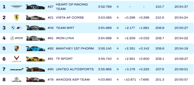 Мерседес команди Iron Lynx став четвертим, п’ятим – Порше Manthey. Серед провалів – Ферарі №54, Макларен №59 і Форд №88, які не пройшли до вирішального етапу.