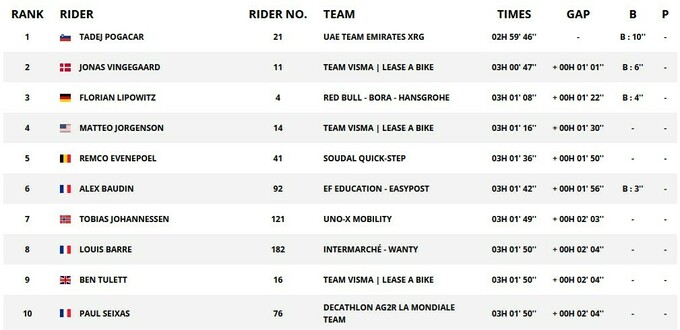 Лідером загального заліку після шостого етапу став Тадей Погачар. Другим з відставанням у 43 секунди йде Йонас Вінгегор.