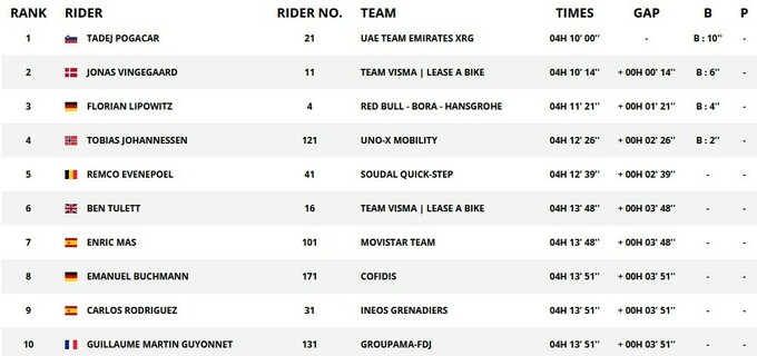 1. Тадей Погачар (Словенія, UAE Team Emirates XRG) – 4:10:00