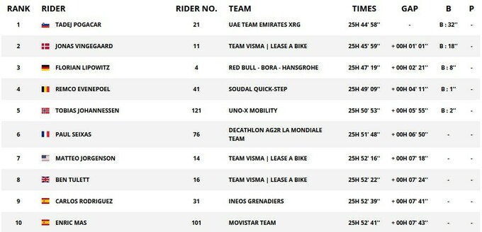 Лідером загального заліку після сьомого етапу залишається Тадей Погачар. Другим з відставанням в 1 хвилину і 1 секунду йде Йонас Вінгегор.