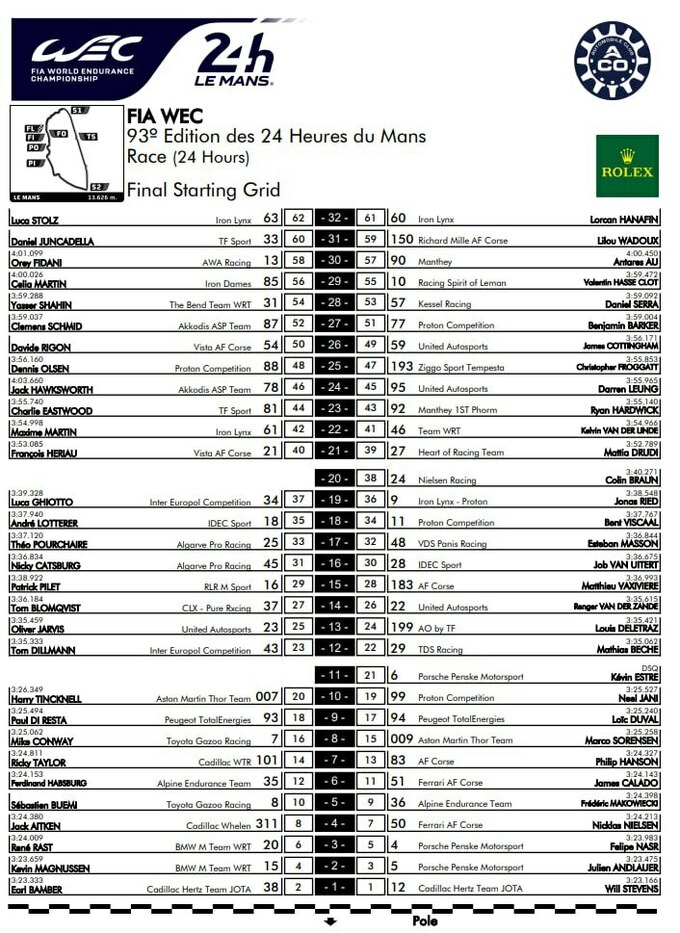 У кваліфікації напередодні перший ряд вибороли екіпажі Каділлак – вперше з 1967 року. Натомість Феррарі та Порше частково провалили цей етап: два екіпажі Скудерії не увійшли до фінальної десятки, а екіпаж Порше №6 дискваліфікували через недовагу й він стартував 21-м.