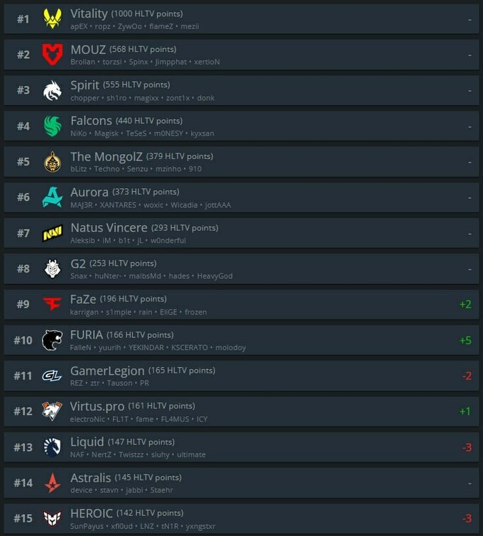 Лідером рейтингу з великим відривом залишилася Vitality – 1000 очок, далі йдуть MOUZ (2 місце, 568 очок) та Spirit (3 місце, 555 очок), які входять у трійку найкращих команд планети. Falcons (4) та The MongolZ (5) також утримують високі позиції, що підтверджує силу нових складів та розвиток азійського регіону.