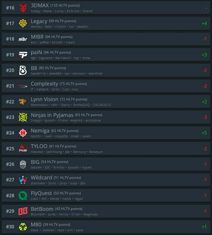 Серед тих, хто втратив позиції, варто відзначити Liquid (13 місце, -3) та Heroic, які опустилися на 15-те місце, також на три сходинки вниз. Героїв знову переслідують кадрові проблеми та нестабільність.