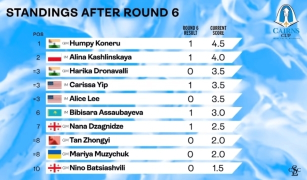Після дня відпочинку учасниці повернулися до боротьби в Cairns Cup 2025. Усі партії без винятку завершилися результативно, і ця шахова бійня вивела гросмейстера Хампі Конеру на перше місце. Вона перемогла свою співвітчизницю Харіку Дронаваллі, яка разом із нею перебувала в трійці лідерок. Третьою шахісткою з лідируючого тріумвірату була міжнародний майстер Еліс Лі, яка програла партію чорними Бібісарі Асаубаєвій.