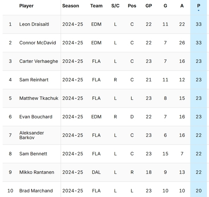 По 33 очки набрали зіркові форварди Едмонтона Леон Драйзайтль і Коннор Макдевід. Драйзайтль закинув більше шайб (11 проти 7) і знаходиться на першому місці.