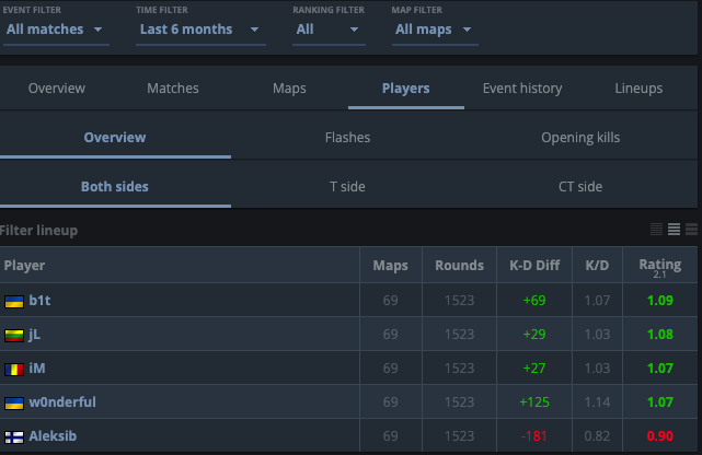 Статистика гравців NAVI за останні 6 місяців (69 карт)
