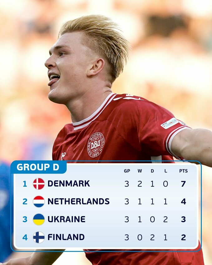 Визначені всі 8 чвертьфіналістів: Іспанія, Італія (група A), Англія, Німеччина (група B), Португалія, Франція (група C), Данія, Нідерланди (група D).