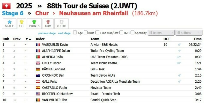 Tour de Suisse 2025. 20 червня. 6-й етап, Чур - Нойхаузен-на-Рейнфалл (186,7 кілометра)